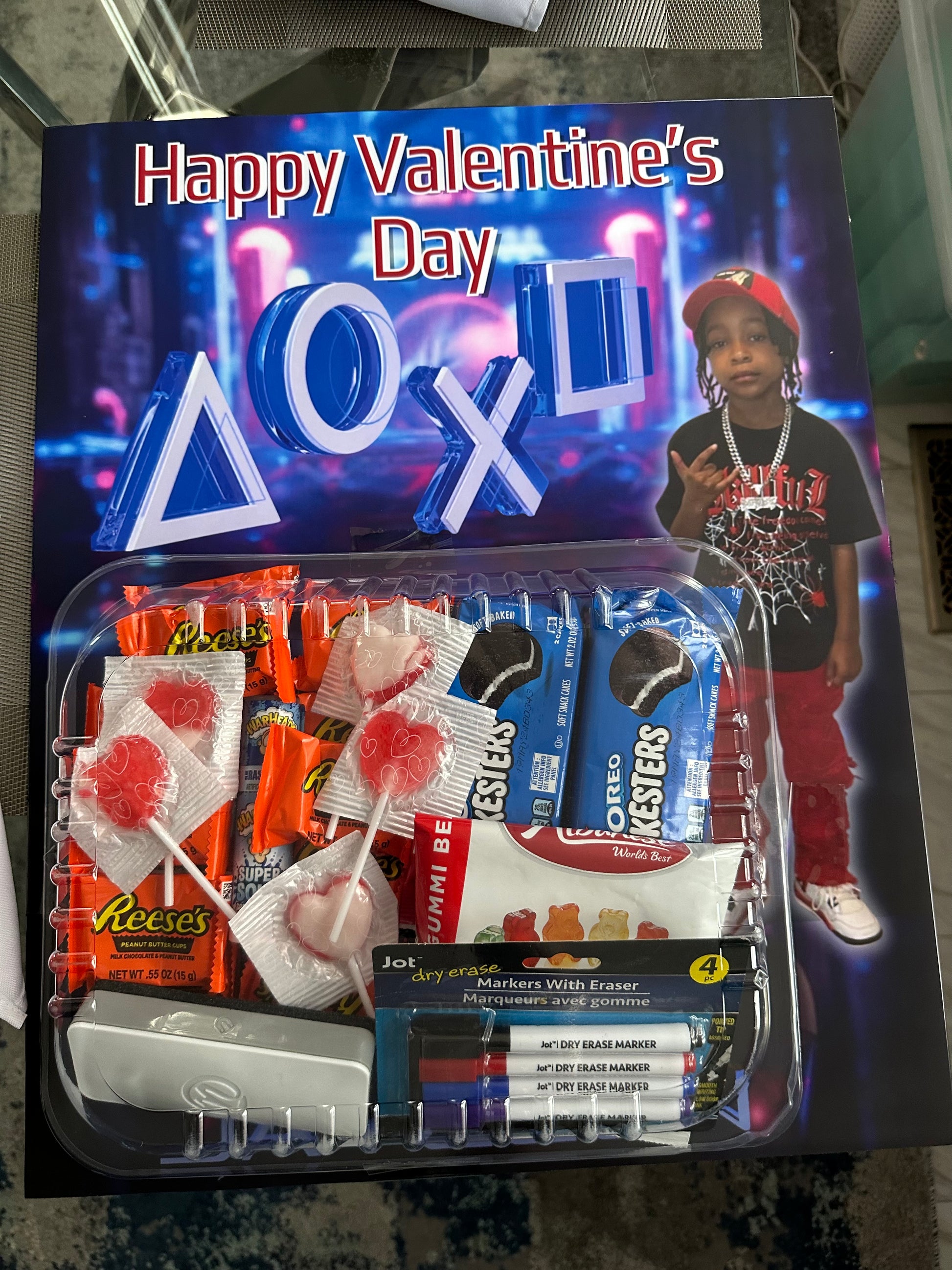 Custom theme design card, Chip, Popcorn, Rice Krispies treat, ring pop, candy and small toy trinkets.